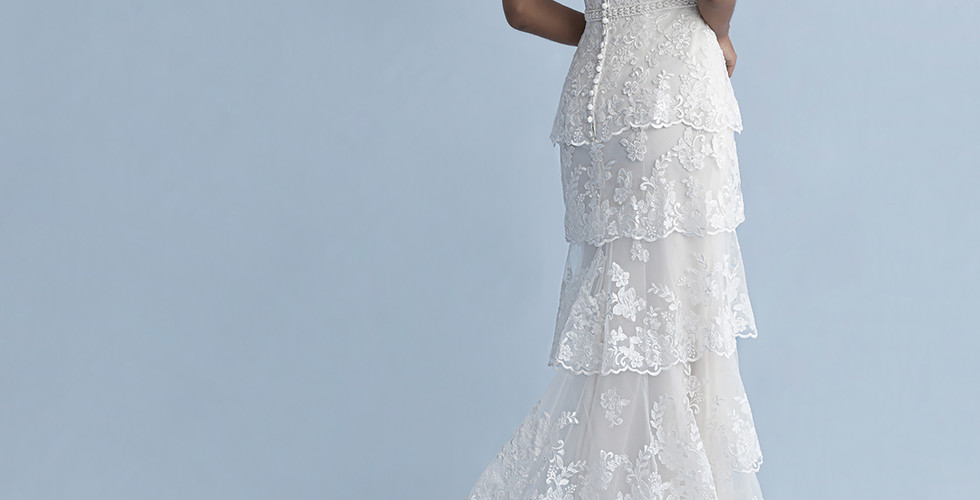 The Ariel mermaid style gown is truly inspired. Cascading layers of soft tulle and organza invoke the rolling waves of the ocean. Ruching on the strapless, sweetheart neckline is feminine and flattering. Like a long strand of pearls, beautiful covered buttons down the back of this gown create a dramatic effect
